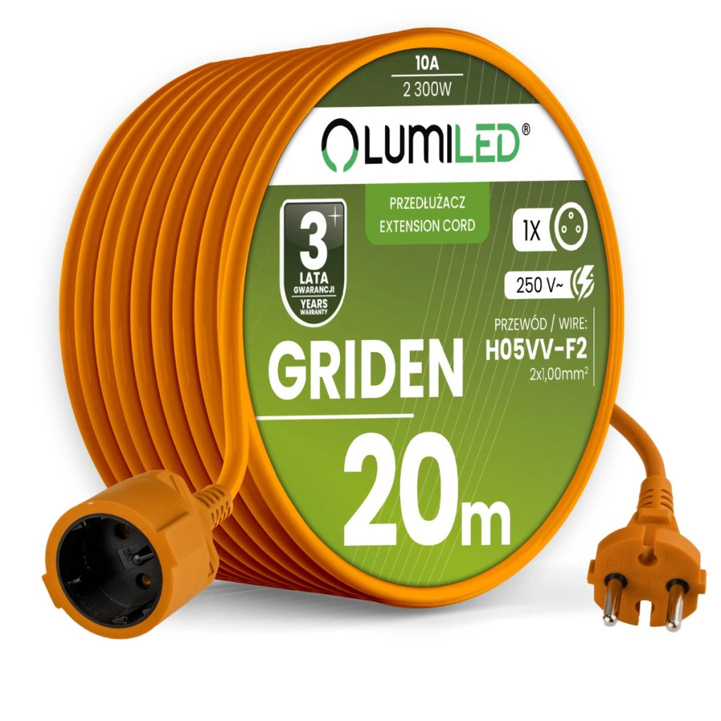Kerti hosszabbító kábel építési szimpla 1 aljzat 20m narancssárga zsinór GRIDEN Lumiled